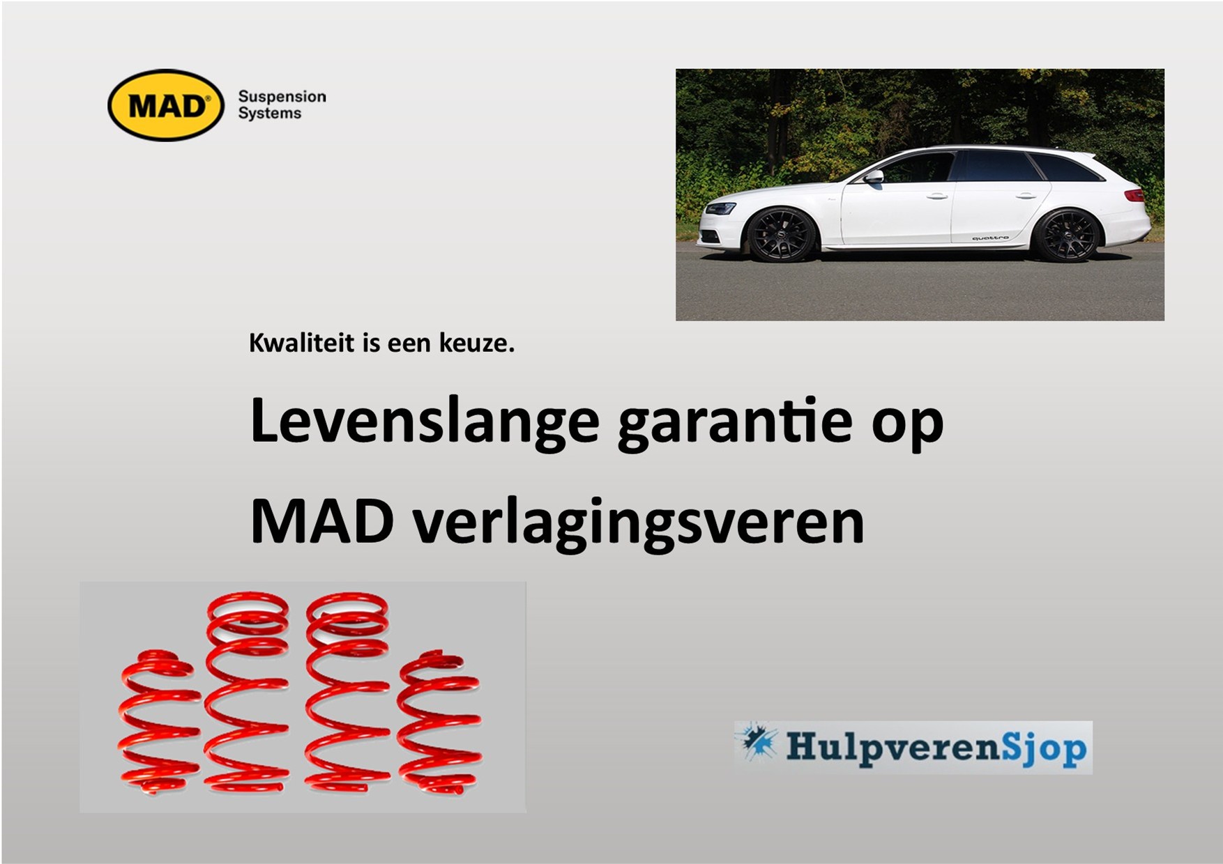 De kwaliteit van de nederlandse MAD veren wordt internationaal erkend. De meeste verlagingsveren zijn door TÜV en GOCA goedgekeurd. En worden in meer dan 80 landen wereldwijd verkocht. De keuze van de gebruikte materialen zorgt voor de hoogste kwaliteit veren. Wij zijn zo overtuigd van deze kwaliteit dat we levenslange garantie geven op de verlagingsveren. Geur gezeur! (zie hiervoor onze voorwaarden).